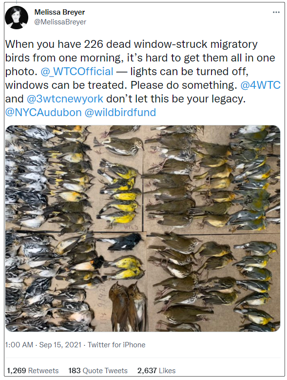 然而,据布雷耶称,在她收集鸟类尸体时,其中35只鸟类尸体在世贸中心大楼的玻璃旁被发现。