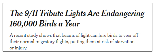 然而这并不是“9·11”灯光秀第一次遭到质疑,据美国纽约时报2019年报道,每年约有16万只鸟因为“9·11”灯光秀而收到影响,2009年至2016年间,共危及110万只鸟类。
