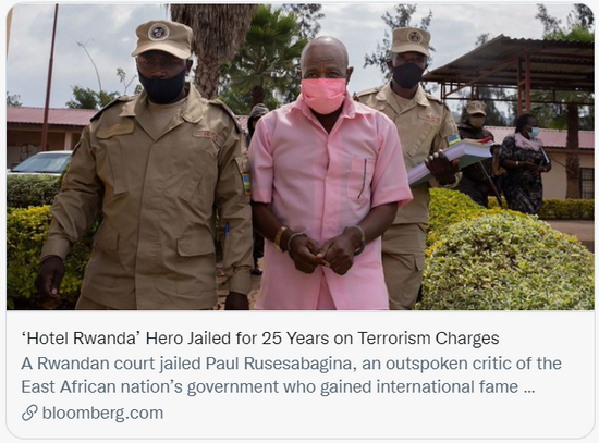 《卢旺达饭店》中的“英雄”因恐怖主义指控被判25年监禁。/社交媒体截图
