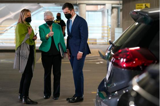 2021年4月22日,美国华盛顿,白宫气候顾问吉娜·麦卡锡和美国交通部长皮特·布蒂吉格参观当地电动汽车充电站。图|人民视觉