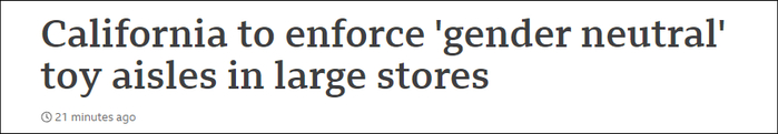 BBC称,加州是美国第一个要求大型零售商以性别中立的方式展示玩具和育儿用品的州。法案称,这些变化将帮助消费者发现 “类似产品中的不合理差异”,并解决儿童产品中的性别偏见。