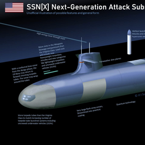 美国《动力》网站猜测,美国海军新一代攻击型核潜艇SSN(X)将安装更多的鱼雷发射管,把敌方水面舰艇和潜艇作为猎杀目标。综合已知的信息,SSN(X)的鱼雷舱可容纳62枚武器,包括鱼雷、巡航导弹和反舰导弹,还能发射无人潜航器,诱使敌方船只进入陷阱或者为鱼雷提供终端制导。如果它能继承“海狼”级核潜艇的作战性能,显然将在安静性、最大潜深和航速上等传统指标上有所突破。