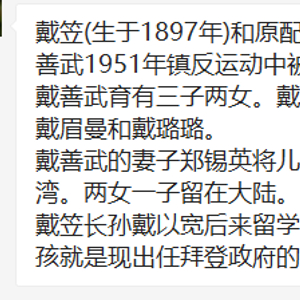 中文社交平台上流传的一则消息称,戴琪是国民政府军事委员会调查统计局(军统)首脑戴笠的曾孙女,“戴笠的长孙戴以宽留学美国并育有一子一女,他的女儿就是如今拜登政府的贸易代表戴琪”。