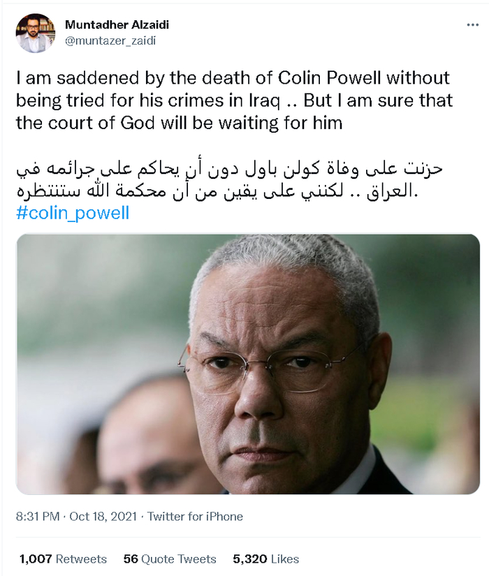 曾在2008年向时任美国总统的小布什愤怒地扔出了自己的鞋子,以宣泄对美国毁掉自己国家不满之情的伊拉克记者扎伊迪,如今则在自己的社交账号上表示:“我对于科林·鲍威尔的死感到悲伤,因为他还没有因为他犯下的罪行而被伊拉克审判。但我确信上帝的法庭正在等着他”。