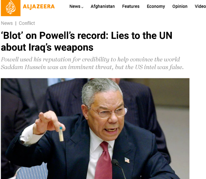 《华盛顿邮报》亦在一篇报道中表达了类似的观点,即鲍威尔是被他的总统、副总统和国防部长还有这三人驱使的情报人员给坑了,他并不知道情报是假的。《华盛顿邮报》还强调说,鲍威尔后来在公开场合一直都表示他为当年的选择感到“遗憾”和“痛苦”,称那是他人生的“污点”。
