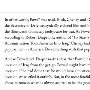 这些记者指出,鲍威尔并不是被“蒙蔽”了,他和他的下属其实已经察觉出了伊拉克的情报有问题,而且他也接到了不少说情报有问题的警告,但他并没有选择指出这些问题,阻止小布什政府的错误。