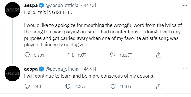 10月25日,Giselle通过aespa官方推特全英文道歉,称自己会继续学习,并且会更加注重自身言行。