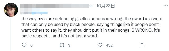 值得一提的是,Giselle是女团aespa中的“语言担当”,她是日韩混血,有留学背景,可以流利地讲日语、韩语和英语三国语言。她在跟唱中毫不避讳地唱出“niggas”一词,激怒了众多海外粉丝,他们纷纷发声怒批。
