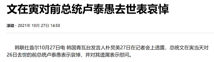 [环球网报道]据韩联社报道,韩国青瓦台发言人朴炅美27日在记者会上透露,韩国总统文在寅当天对26日去世的前总统卢泰愚表示哀悼,并对其遗属表示慰问。