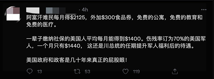当地时间10月18日,有推特用户称,在美“阿富汗难民每月可以获得2125美元,外加300美元的食品券,以及免费的公寓、免费的教育和免费的医疗”,并将此同美国公民及退伍军人的待遇相比较。