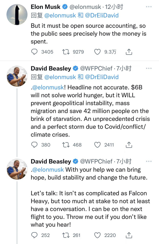 此前,WFP署长戴维·比斯利在参加访谈节目时呼吁马斯克、亚马逊创始人杰夫·贝佐斯站出来“一次性援助”来解决粮食危机。比斯利称,“只要60亿美元就能挽救全球4200万人的生命。”