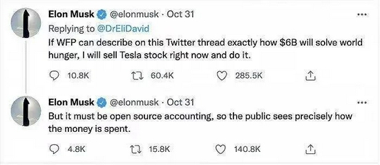 对此,当地时间10月31日,马斯克回应道,“如果世界粮食计划署能在这个推特帖子回复中准确讲述60亿美元将如何解决世界饥饿问题,我将立即出售特斯拉股票并这样做。”