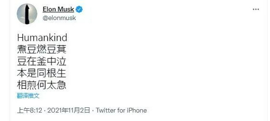 北京时间11月2日上午,“世界首富”、特斯拉CEO埃隆·马斯克(Elon Musk)在个人推特上发布了一首中文诗——曹植的《七步诗》。
