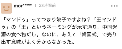 “希杰集团”为了在日本推广所谓的“MANDU”大费周章,不过,一些日本网友并不买账。有人评论称,“所谓的MANDU其实就是饺子吧,‘王MANDU’里面还有个‘王’子,从命名中就能看出来是中国发祥的食品。尽管如此,还故意加上‘韩式(叫法)’发售,无法理解。”