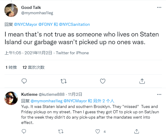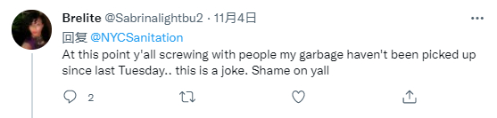 从10月23日起,就有用户陆续在纽约卫生部门(@NYCSanitation)的官方推特下反映有关垃圾清理延迟的问题。