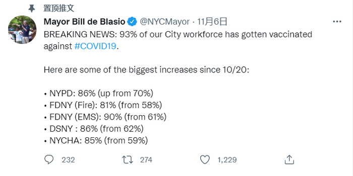 而这一数字正在不断减少。根据白思豪推特提供的数据,截至当地时间11月6日,纽约市环卫工人疫苗接种率已经从62%上升到86%。