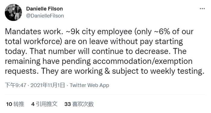 白思豪新闻秘书丹尼埃尔·费尔森(Danielle Filson)11月1日表示,受到该疫苗令的限制,约9000名市政工作人员将进行无薪休假。