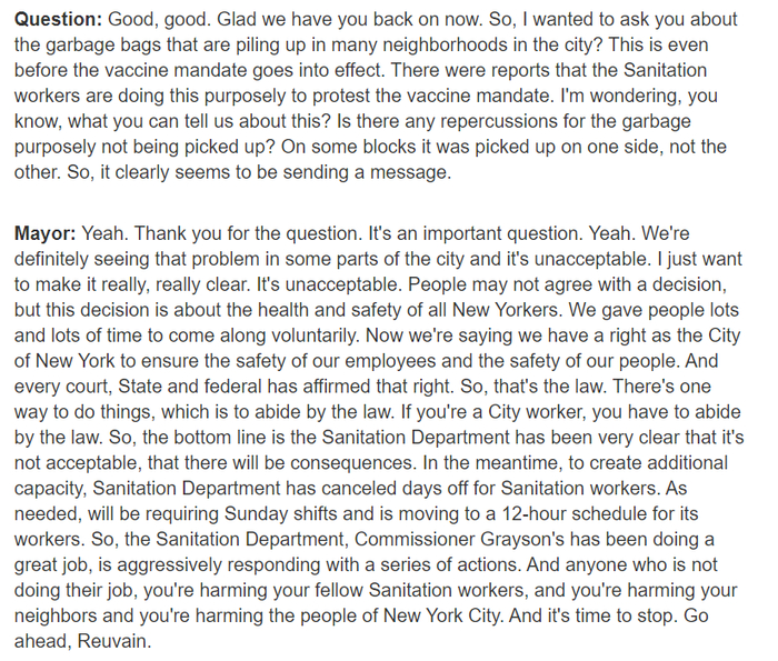 综上所述,纽约部分社区垃圾成堆确有其事,纽约市长办公室于10月20日出台的“疫苗令”是造成这一情况的因素之一。该疫苗令要求环卫、消防、警察等部门工作人员出示接种疫苗证明,否则将被迫进行无薪休假。由于疫苗令的限制,部分市政工人被迫进行无薪休假,导致劳动力短缺。同时,大量消防员集中休假,以抗议强制执行的疫苗令。