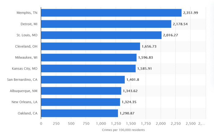 根据statista的统计结果,在2020年这个被《时代》杂志称为美国有记录以来枪支暴力最严重的年份之一,芝加哥也没有“挤进”全美前十个最危险的城市榜单。2020年,田纳西州最大的城市孟菲斯每10万居民中就有2351起凶杀案,号称美国“最危险”的城市。底特律和圣路易斯分别排在第二和第三。