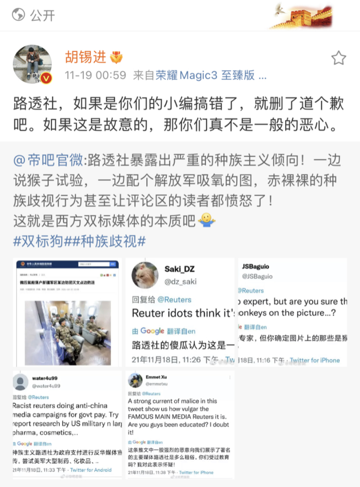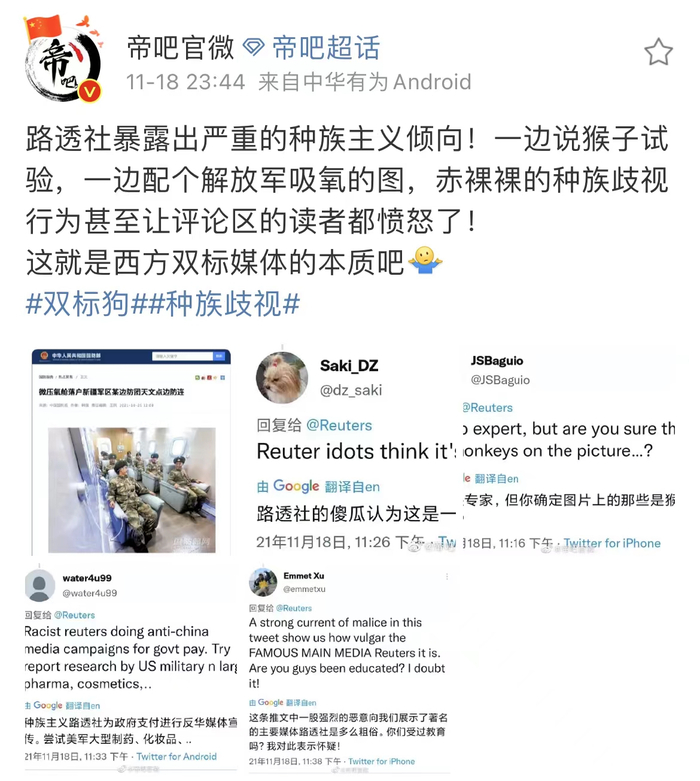 @帝吧官微昨晚(18日)发布了一则指责路透社的微博。该微博写道:“路透社暴露出严重的种族主义倾向!一边说猴子试验,一边配个解放军吸氧的图,赤裸裸的种族歧视行为甚至让评论区的读者都愤怒了!这就是西方双标媒体的本质吧。”