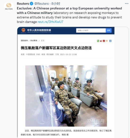 路透社推特18日发文称,“独家:一名在欧洲顶尖大学工作的中国教授与中国军事实验室合作,将猴子暴露在极端海拔条件下以研究它们的大脑并研发防止大脑损伤的新药。”