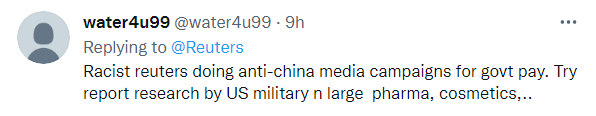 “种族主义的路透社为了政府的钱而进行反华的媒体宣传活动。试试去报道美国军方在大型制药、化妆品等领域的研究。”