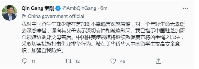 [环球网综合报道]中国驻美大使秦刚发推:我对中国留学生郑少雄在芝加哥不幸遇害深感震惊,对一个年轻生命无辜逝去深感痛惜,谨向其父母表示深切哀悼和诚挚慰问。我已指示中国驻芝加哥总领馆协助郑父母善后。中国驻美使领馆将继续敦促美方将凶手绳之以法,采取切实措施打击仇亚排华行为。希在美华侨华人中国留学生提高安全意识,加强自我防护。