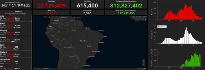 根据美国约翰斯·霍普金斯大学统计数据,截至北京时间2021年12月4日下午3时22分,巴西新冠肺炎累计确诊病例22129409例,累计死亡病例615400例。值得一提的是,巴西超61.5万的新冠肺炎死亡人数位居世界第二,仅次于美国。