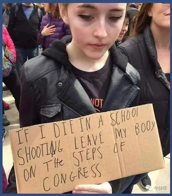 写到这儿,看到有朋友传来的一张图片,一位美国女孩在悼念现场哭泣,她手里的纸牌上写着: