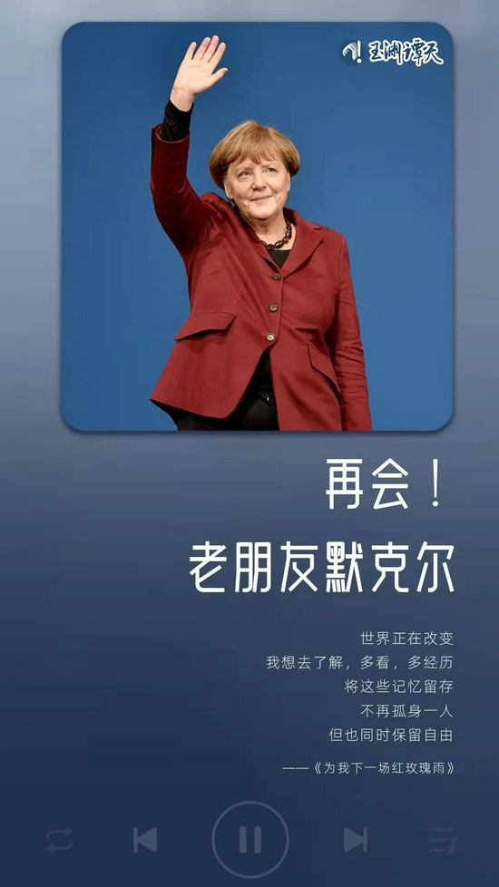 在自己的告别仪式上,默克尔选择了一首名为《为我下一场红玫瑰雨》的歌曲,其中有三句歌词。