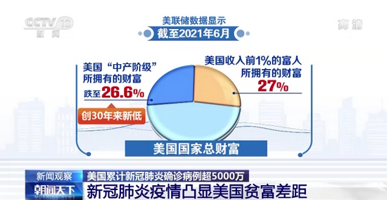 美联储数据显示,截至2021年6月,美国收入排在中间60%的所谓“中产阶级”所拥有的财富,在国家总财富中占比已经跌至26.6%,创30年来新低,而收入前1%的富人却拥有27%的国家财富,超过了“中产阶级”。