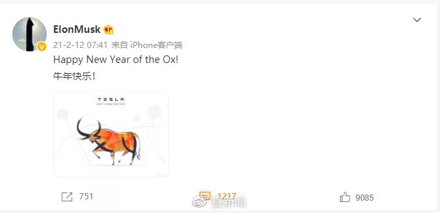 马斯克在微博上努力塑造爱中国的美国商人形象,比如,祝中国网友牛年快乐。虎年马上来了,不出意外估计他也会来一条拜年贴子。