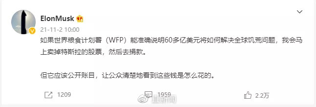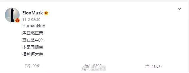 原因是回应联合国粮食计划署一位官员喊话马斯克捐钱,没想到马斯克既没有置之不理,也不是公开回呛,而是发了一首内涵的中国古诗,不知道“歪果仁”如何理解这首古诗的含义,兄弟相残曲解为委婉拒绝迫捐,这事估计也只有马斯克能干得出来。中国网友由衷感叹道,拉近与自己的距离,马斯克竟然启用了1000多年前的曹植。