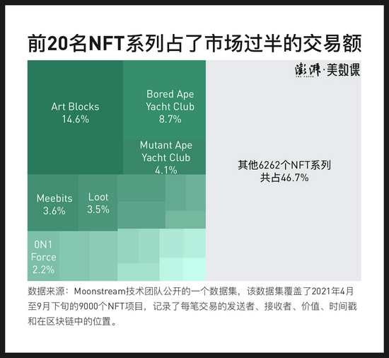 数据分析发现,若以交易额来排序,前20名的NFT系列的交易额,占了市场交易总额的53%,但以数量而言,它们只占所有共计6283个系列的0.3%。