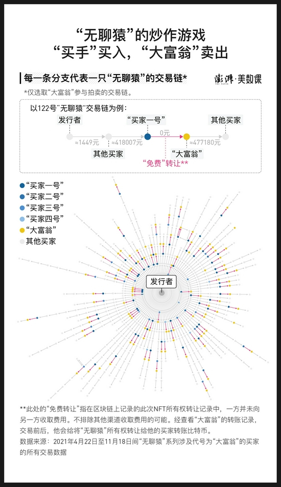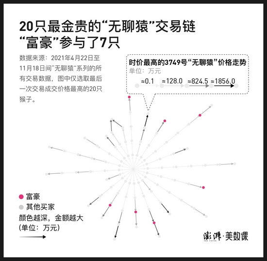 与“大富翁”和他的“军团”不同,花钱最多的买家“富豪”,买入卖出都是亲力亲为,而且成就不凡。数据爬取时身价最高的20只猴子,有7只他都参与了交易。
