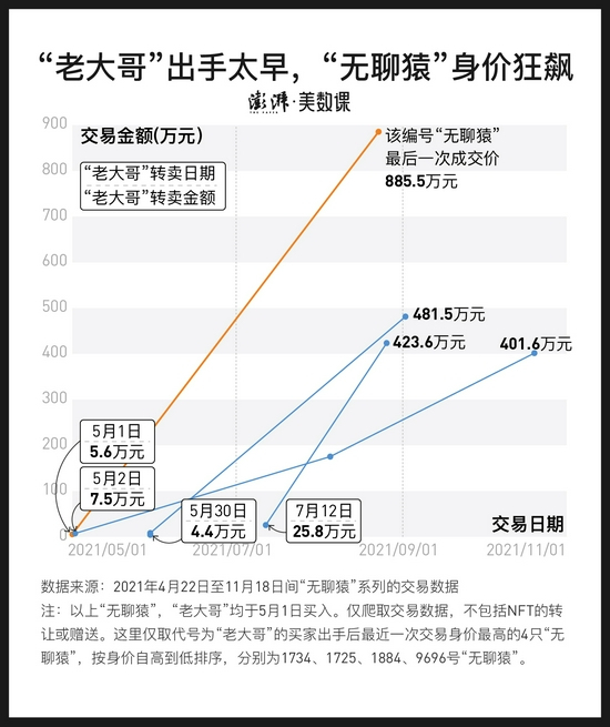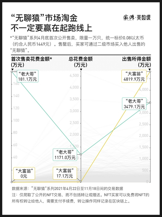 但若仅从“无聊猿”系列明面上的后续多次转卖交易来看,这1250只猿猴并没有让“老大哥”变成市场上最神勇的淘金者。按二手交易的出售金额计算,“老大哥”只凭“无聊猿”赚得了约合3478万元人民币,在所有交易者中排第三。最出色的买家,从明面上看,入场迟,后来仅以17万元的成本,最终收益4820万元,是赚得盆满钵满的“大富翁”(为方便叙述,后文称他为“大富翁”)。