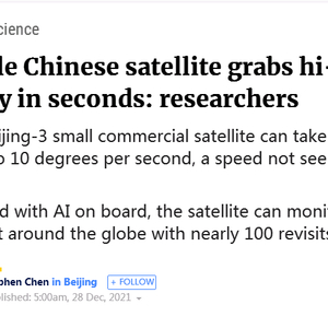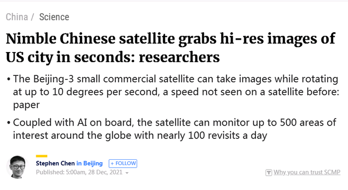老司机想说的是,中国研制和发射“北京三号”卫星的目的,是为了满足国家建设的需求。而《南华早报》却执意将其拍摄的卫星照片与特殊的成像模式,生拉硬凑地与军事用途扯在一起。无论是所谓的“识别地面军车”,还是“反复监测地面敏感目标”,都明显诱导读者往“中国研制小卫星用于特殊军事用途”的方向去联想。