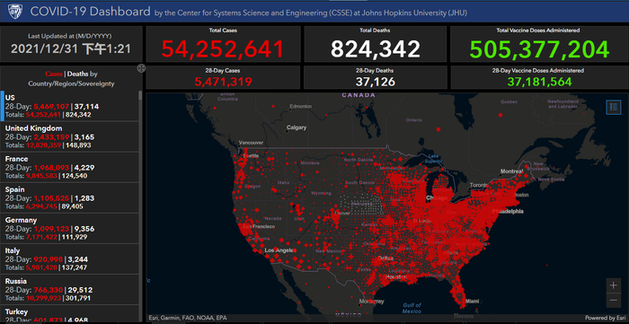 根据美国约翰斯·霍普金斯大学统计数据,截至北京时间2021年12月31日下午1时21分,美国新冠肺炎累计确诊病例达到54252641例,累计死亡病例达到824342例。在过去一天里,美国新增确诊病例647067例,新增死亡病例1409例。