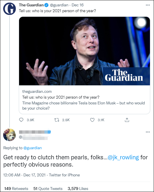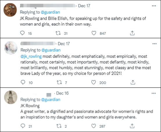 而通过《卫报》这篇文章下的推特留言可以看到,许多网民在投票刚开始,就提名罗琳当选“2021年度人物”。