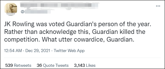 “J.K。罗琳当选《卫报》年度人物。《卫报》非但没有承认这一点,反而扼杀了竞争。真是太懦弱了,《卫报》。”