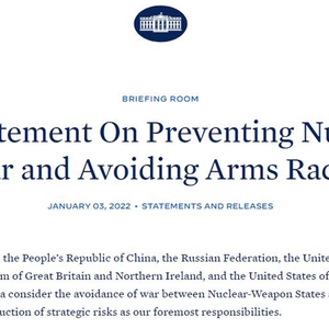 五个核武器国家领导人关于防止核战争与避免军备竞赛的联合声明说,中华人民共和国、法兰西共和国、俄罗斯联邦、大不列颠及北爱尔兰联合王国和美利坚合众国认为,避免核武器国家间爆发战争和减少战略风险是我们的首要责任。