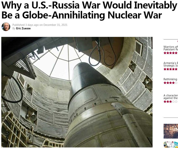 “为什么美俄战争不可避免地会是一场毁灭全球的核战争”,欧洲“当代外交”网站在2021年最后一天发表文章说,即使是俄罗斯也承认,美俄之间的任何常规战争都会摧毁俄罗斯,而不会摧毁美国。因此,只有傻瓜才会选择参加一场他们肯定会输的战争,而且这场战争会彻底摧毁他们自己。这意味着,如果美国以常规(即无核)入侵方式袭击俄罗斯,那么俄罗斯只有两个选择:(1)以常规武器应对,并确保在一无所获的情况下被摧毁;(2)立即发射至少6255枚核弹头,以最大限度地削弱美国和盟国的核报复能力,并能够对美国和盟国发动“第二轮”核攻击。