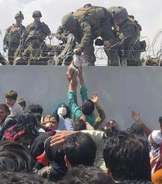 身穿绿色衣服的阿富汗男子用双手托举着一个哭泣的婴儿,竭力想把婴儿递给站在隔离墙上的美军。一名美军士兵似乎也动了“恻隐之心”,伸手将孩子接过。