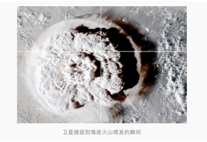 卫星图像显示,大量气体裹挟烟尘形成庞大蘑菇云,在倏忽之间迅速上升穿透对流层,喷发高度至少达到25公里。