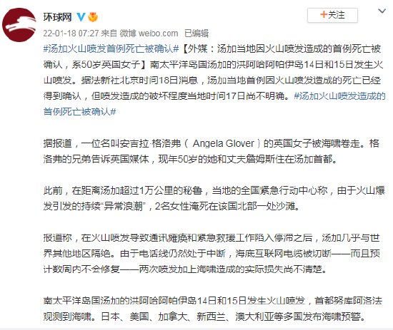 原标题:外媒:汤加当地因火山喷发造成的首例死亡被确认,系50岁英国女子