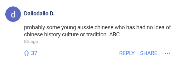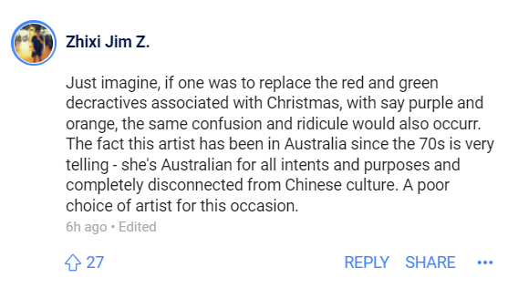 “想象一下,如果有人将圣诞节的红色和绿色装饰物替换成紫色和橙色,会引发同样的困惑和嘲笑。事实是,(新闻中的)这位艺术家自上世纪70年代就一直在澳大利亚,已经说明了问题:她在各个方面都是澳大利亚人,和中国文化已完全脱节。在这种场合,(选择她的作品)真是个糟糕的选择。”