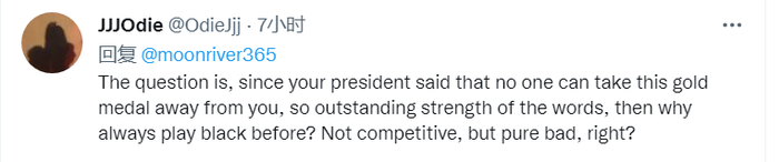 “问题是,既然你们总统说了,没人能把这枚金牌从你手中夺走,如此出众、强势的评价,那为什么之前总是玩黑手段呢?不是(没有)竞争力,而是纯粹的坏,对吧?