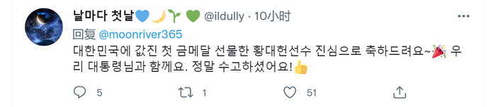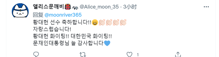 “祝贺黄大宪选手!!自豪!黄大宪加油!!大韩民国加油!!文在寅总统一直感谢您”