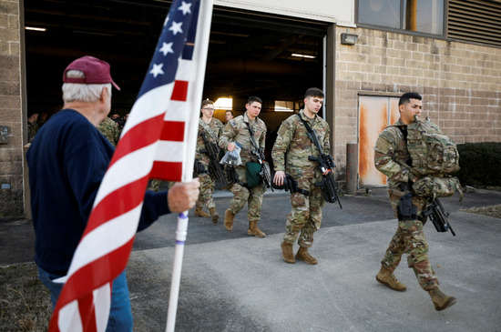当地时间2022年2月14日,美国北卡罗来纳州,俄乌紧张局势升级,美军士兵从布拉格堡的波普机场登机准备部署到欧洲。图/IC