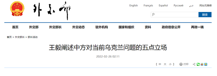 2022年2月25日,国务委员兼外长王毅应约分别与英国外交大臣特拉斯、欧盟外交与安全政策高级代表博雷利和法国总统顾问博纳通电话,重点就乌克兰局势深入交换意见。王毅阐述了中方对乌克兰问题的基本立场,概括为以下五点: